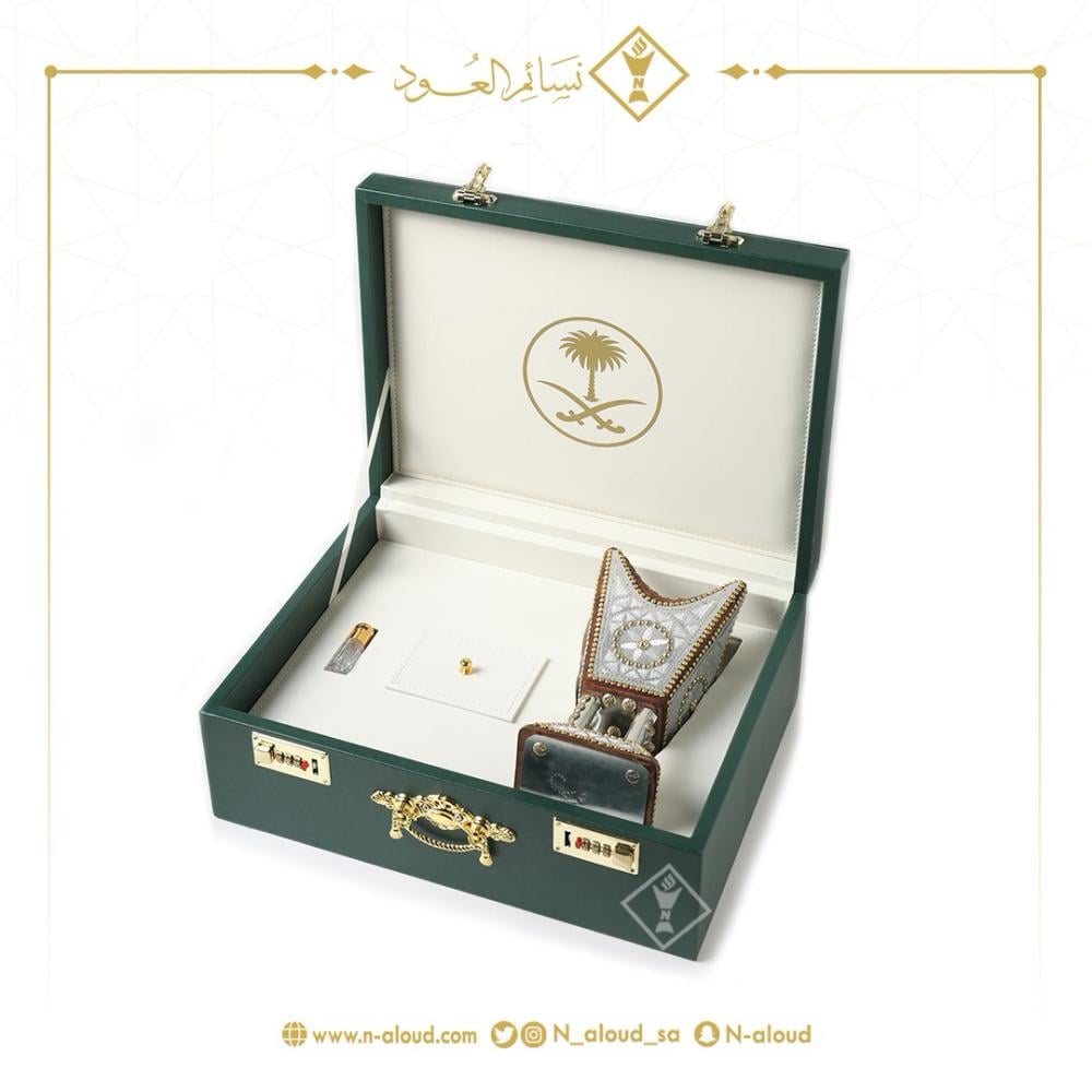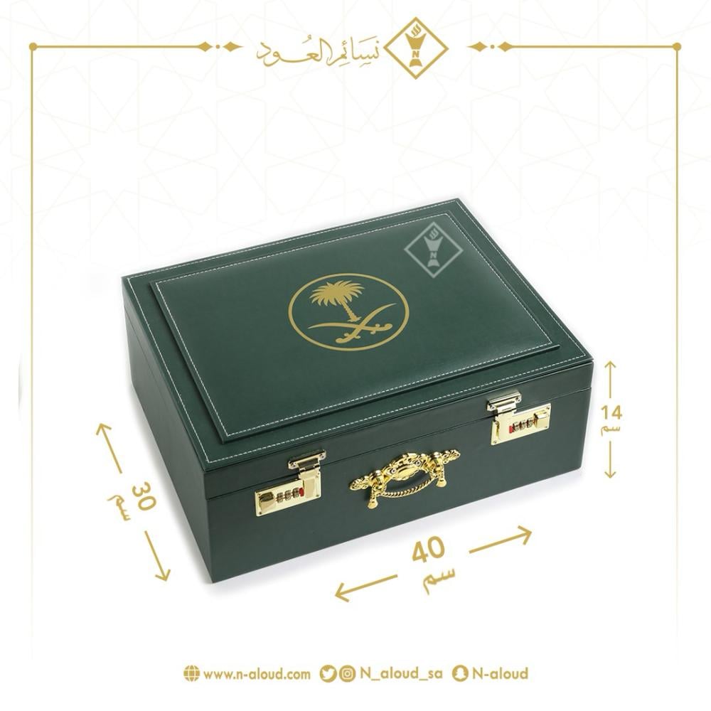 شنطة إهداء ملكية تحتوي على مبخرة ملكية وربع تولة وأوقية بشعار سيفين ونخلة