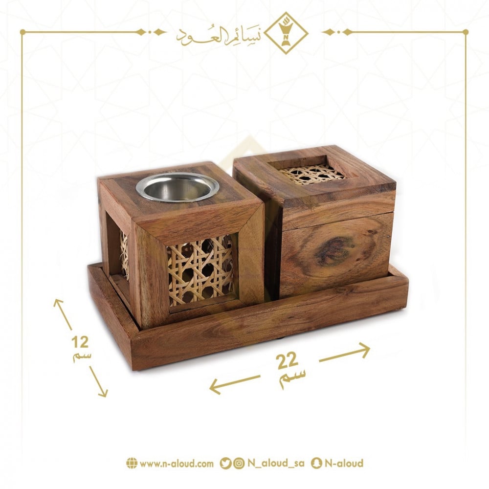 طقم خشب مع خوص مكون من مبخرة مع صينية تقديم وصندوق لحفظ البخور.