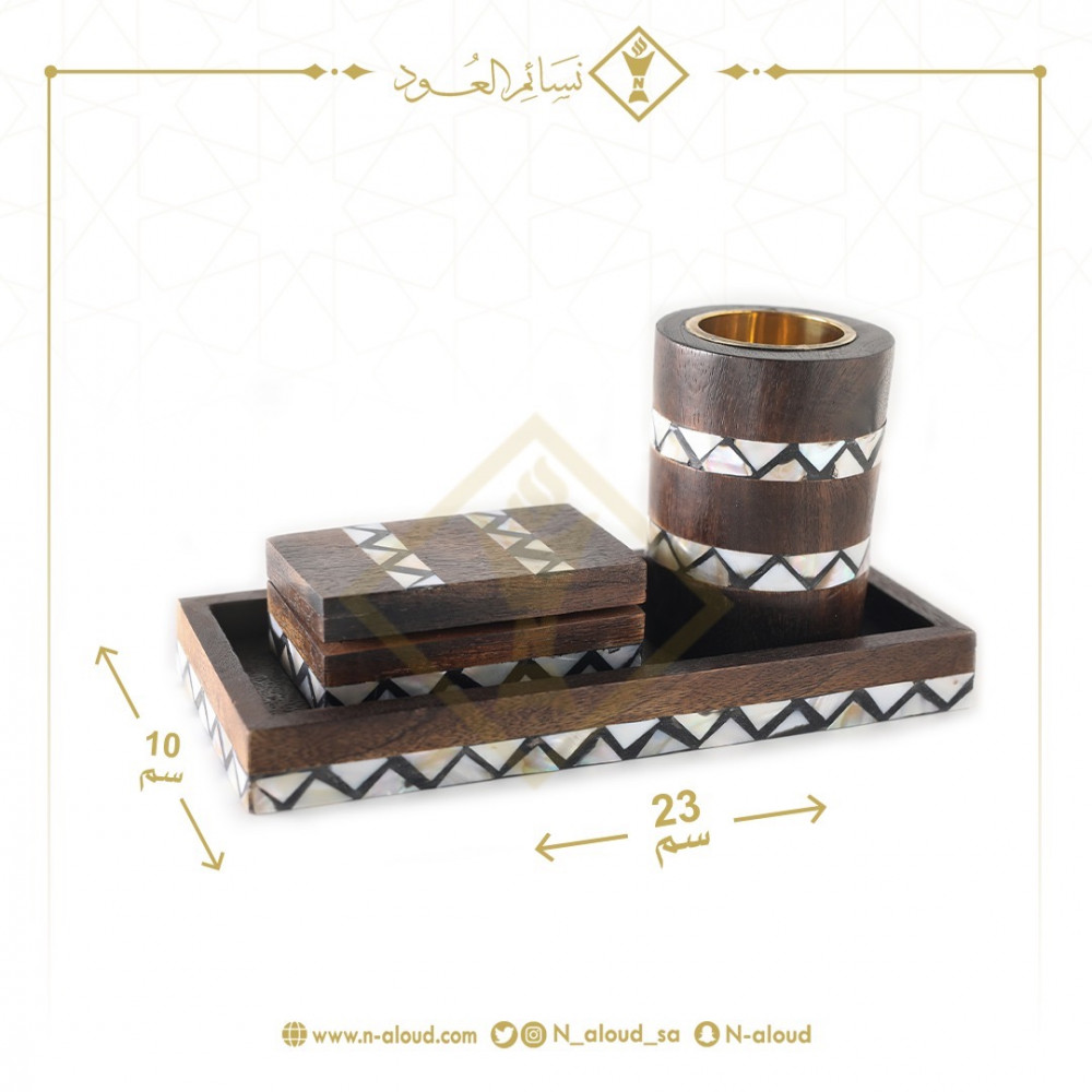 طقم مصنوع من خشب طبيعي مع صدف مكون من مبخرة مع صينية تقديم وصندوق لحفظ البخور.