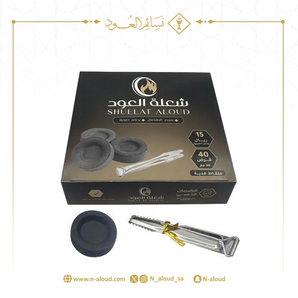 فحم شعلة العود سريع الاشتعال مقاس 4 سم، تحتوي كل علبة على 4 مغلفات بداخل كل مغلف 10 أقراص فحم مع ملقاط معدني هدية.