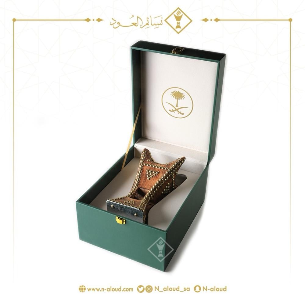 مبخرة حايلية فاخرة مصنوعة من خشب أثل ناشف لون بني محروق غامق مزخرفة بمسامير ذات جودة عالية بارتفاع 24 سم، نحت يدوي متقن، تصنيع خاص بنسائم العود.